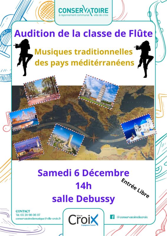 Le Conservatoire vous propose d’assister à l’audition de la classe de flûte, dont la thématique est : Musiques traditionnelles des pays méditerranéens.