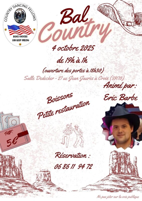 Les Country Dancing Fellows vous propose leur grand bal country annuel đ€ , animĂ© par Ăric Barbe. Rendez-vous samedi 4 octobre, de 19h Ă 1h, Ă la salle Dedecker (ouverture des portes Ă 18h30).