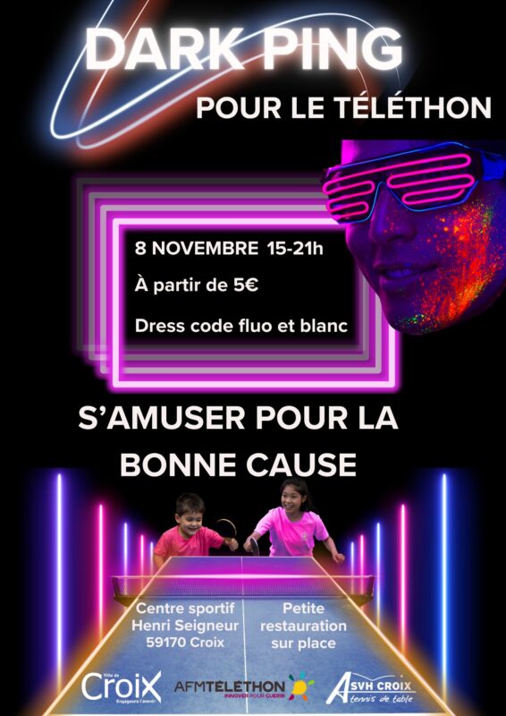 Dans le cadre du Téléthon, l’ASVH Croix Tennis de Table, en partenariat avec À Croix Tous Ensemble, vous invite à une expérience originale : ✨ Dark Ping ✨