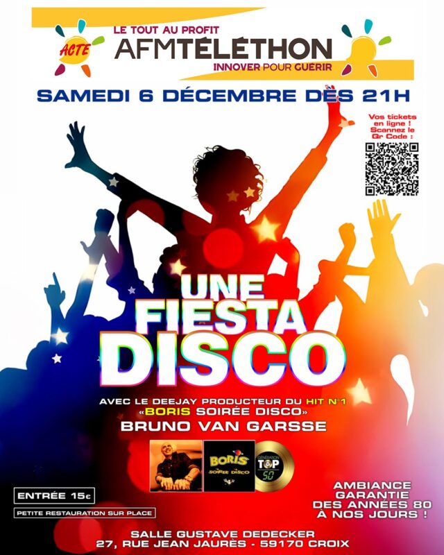 Ambiance garantie, des années 80 jusqu’à nos jours, pour danser, chanter et célébrer le Téléthon dans la bonne humeur. Une petite restauration sera proposée sur place pour prolonger la soirée en toute convivialité.