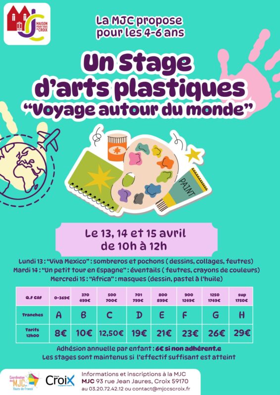 La MJC invite les enfants de 4 Ă  6 ans Ă  embarquer pour un stage d’arts plastiques haut en couleurs. Pendant trois matinĂ©es, ils dĂ©couvriront diffĂ©rentes cultures Ă  travers des activitĂ©s ludiques et crĂ©atives : direction le Mexique, l’Espagne et l’Afrique !